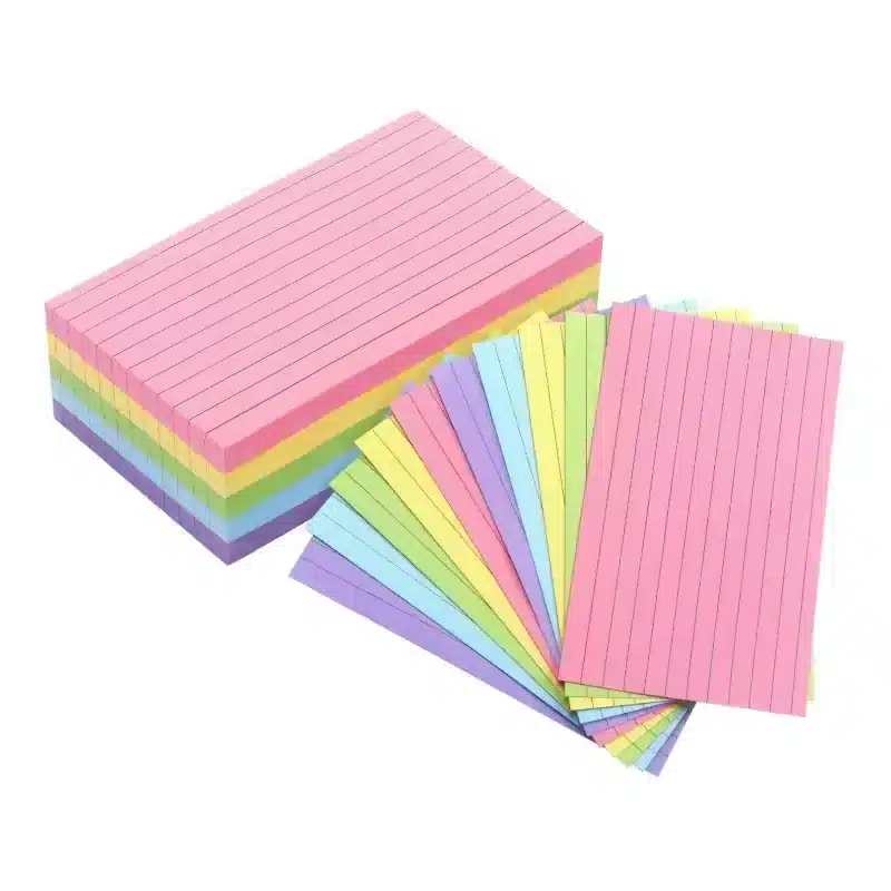 These vibrant, multi-colored index cards are perfect for organizing your notes, projects, and studies at home, school, or office. Each card is ruled for neat writing, making them ideal for creating outlines, flashcards, or reminders in a fun and colorful way. Available in a variety of pastel shades, they add a touch of color to your organization needs.