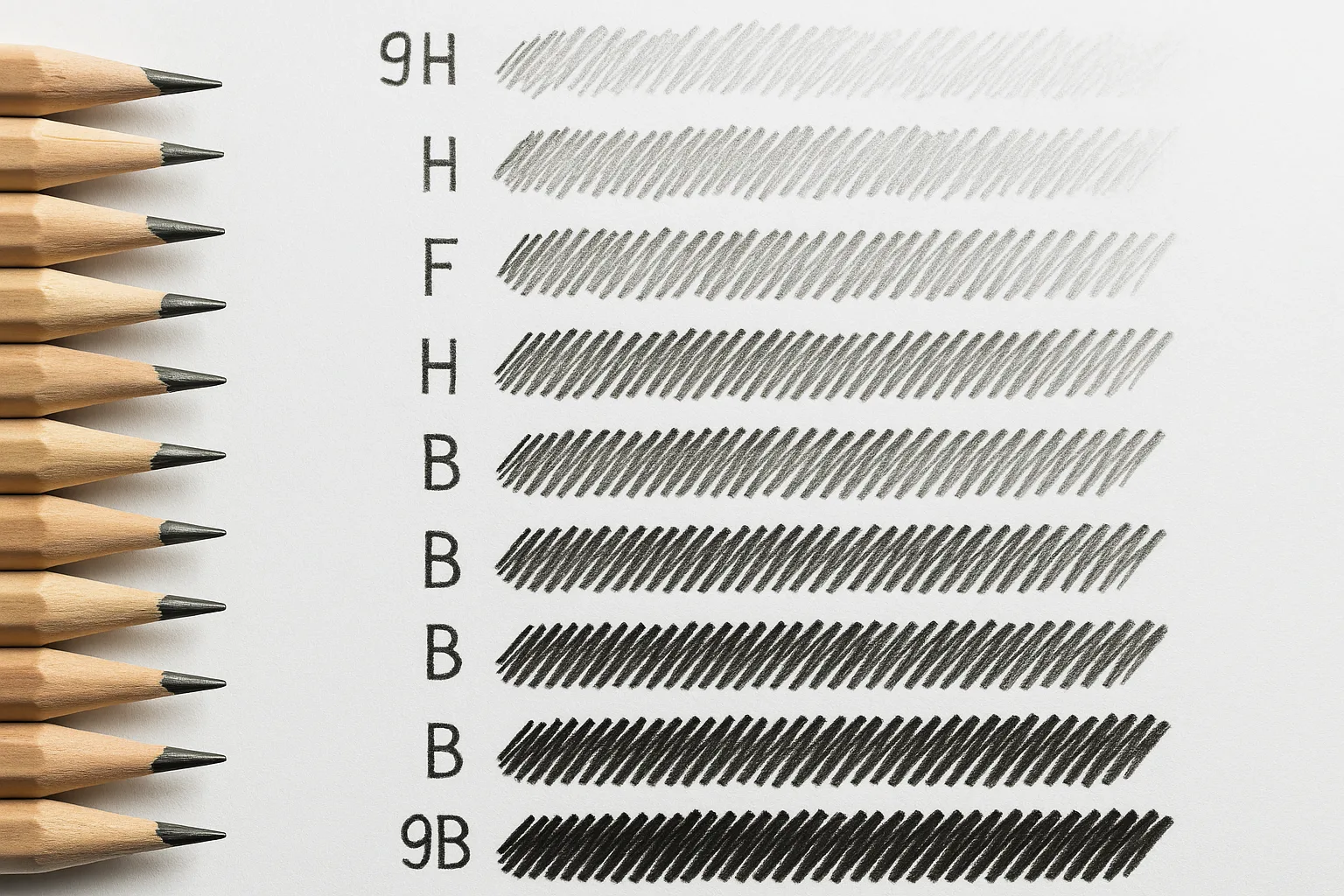 • Comic & line art: F, HB, or B for outlines; darker grades (2B, 4B) for fill, contrast, shadows.