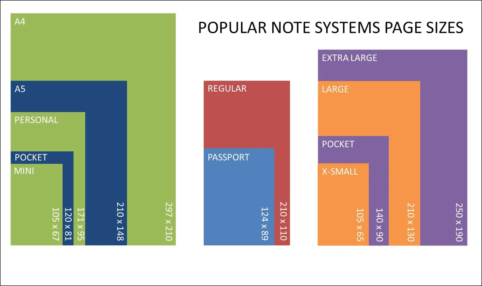 Populaire notitiebloksoorten: A5 = 148 × 210 mm, A6 = 105 × 148 mm, en B5 = 176 × 250 mm (een beetje breder/dikker dan A5, populair in Oost-Azië).
