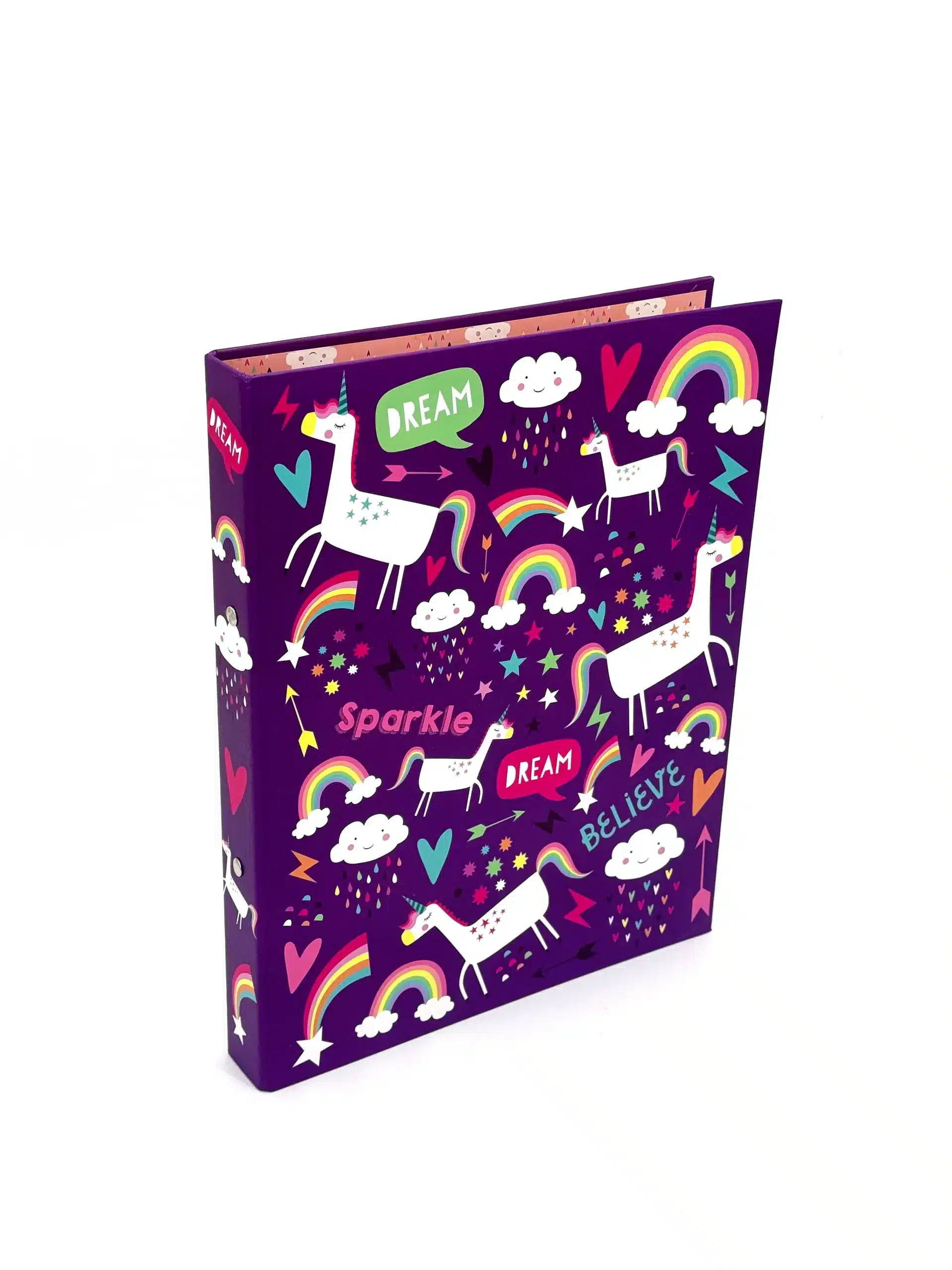 Rozjaśnij swoje miejsce pracy dzięki segregatorowi ringowemu A4 Shiny You Sparkle Dreams Purple. Ozdobiony zabawnymi jednorożcami, żywymi tęczami i pozytywnymi przesłaniami, takimi jak "Dream", "Sparkle" i "Believe", ten segregator jest idealnym wyborem dla uczniów, nauczycieli i każdego, kto chce dodać trochę zabawy do swojej organizacji. Wykonany z trwałych materiałów, jest idealny do przechowywania dokumentów i dodawania odrobiny kaprysu do biura lub miejsca do nauki.