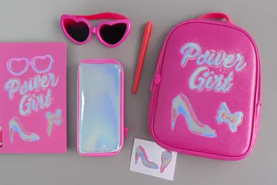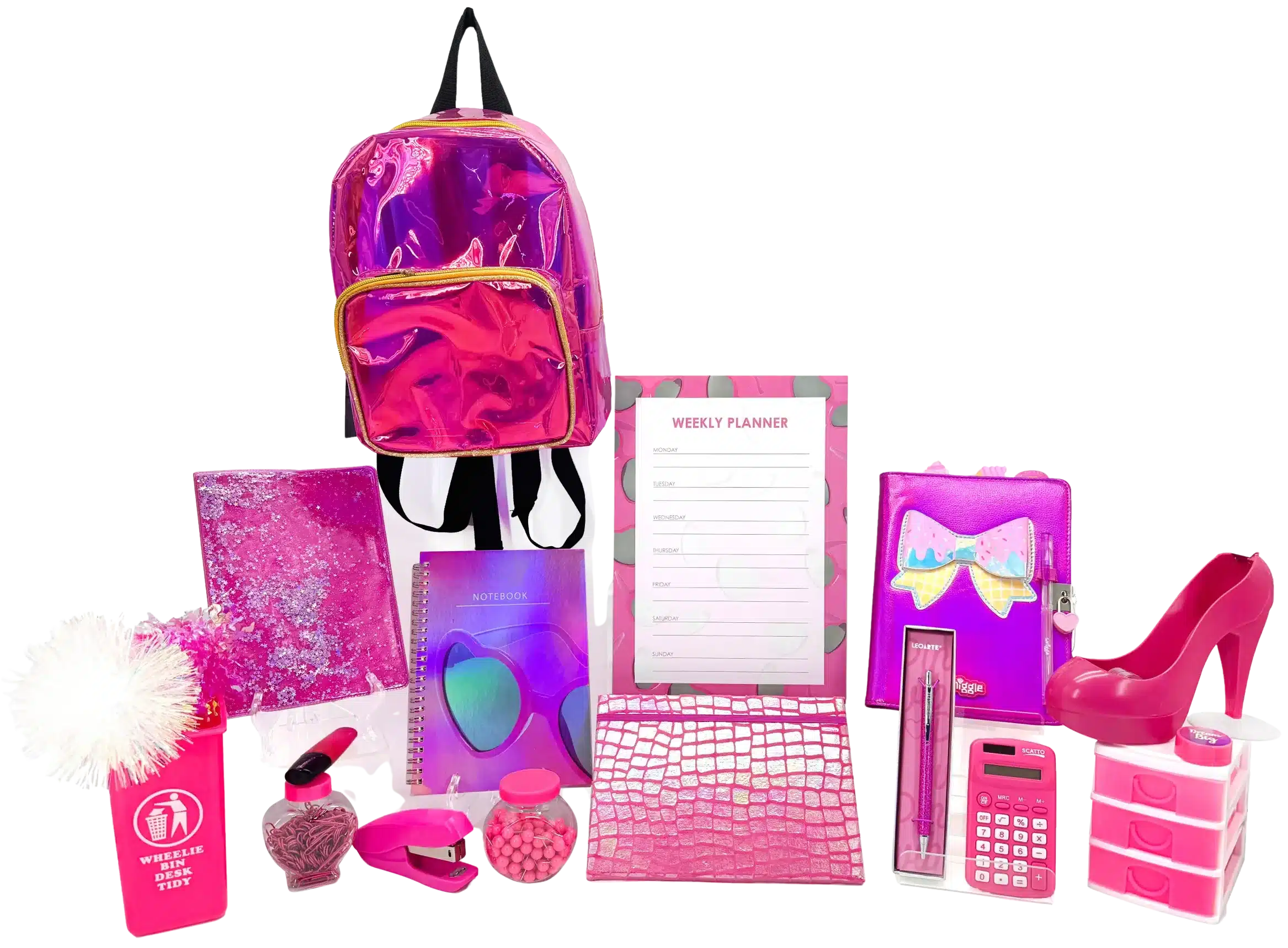 - Vibrant Design: The use of hot pink is bold and energizing, intended to uplift the user with its empowering hue. The addition of holographic and metallic finishes, such as on notebooks, backpacks, and pens, adds a touch of glamour and sophistication.