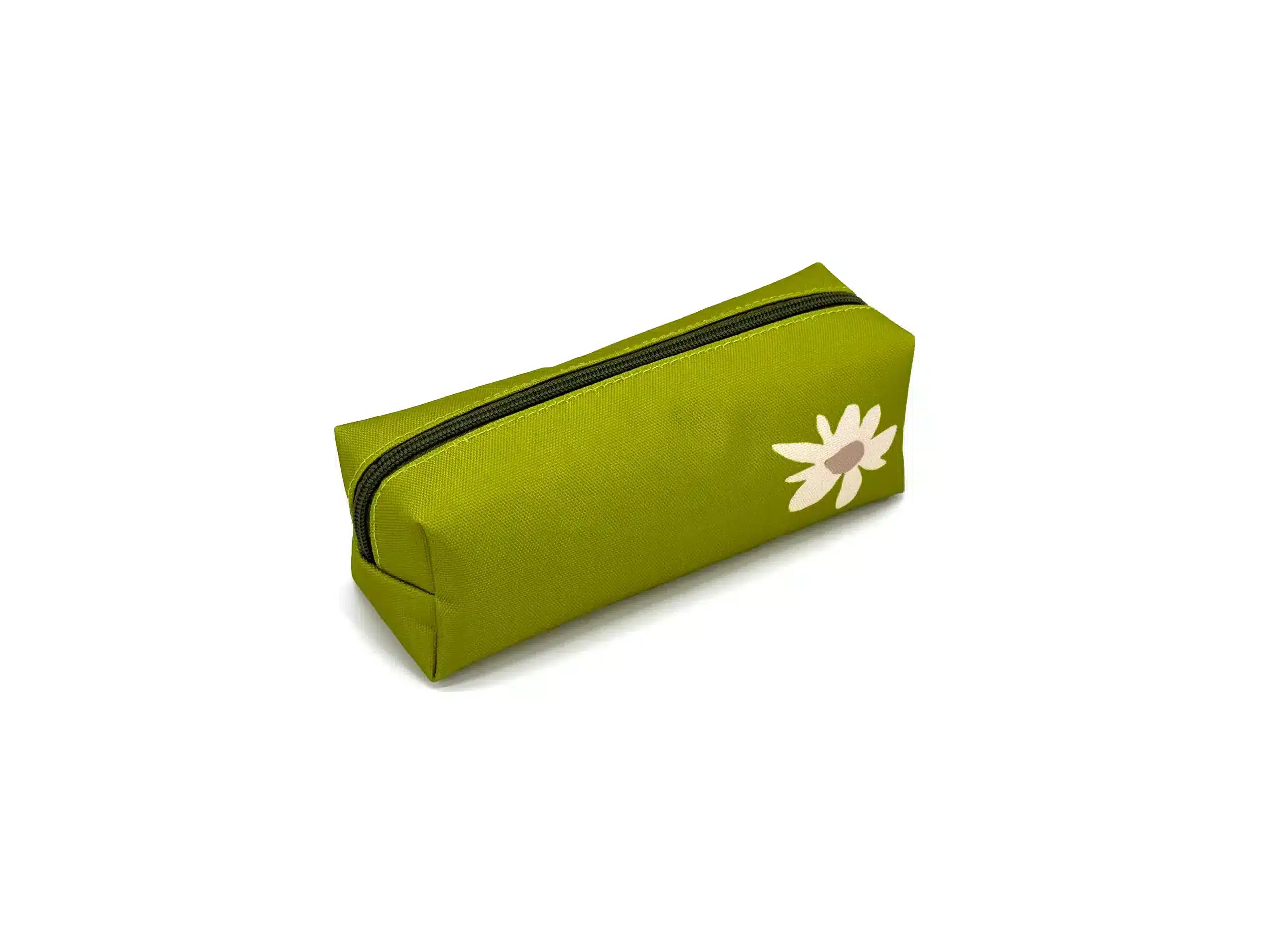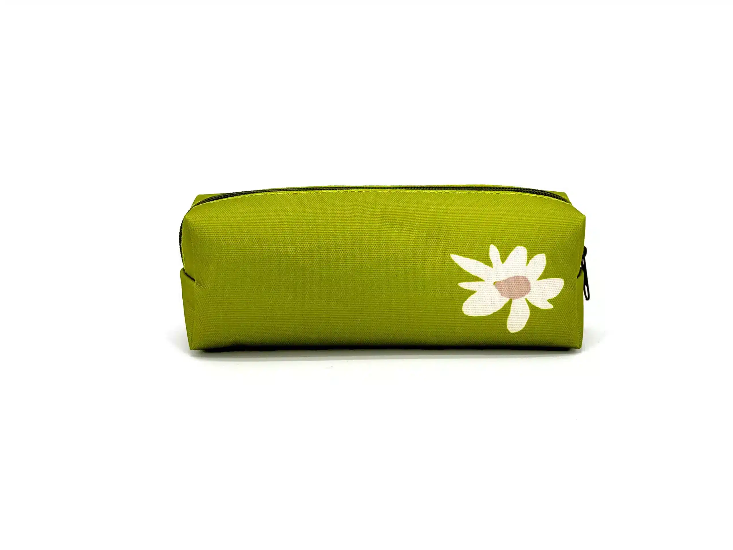 This is a sleek and compact green pencil case, featuring a charming white daisy flower design on the side. It is made of durable fabric and has a zip closure, making it perfect for storing pens, pencils, or other small stationery items.